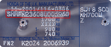 Igale sõidukile antakse unikaalne tehasetähis (VIN). Honda tehasetähised koosnevad alati 17 kohalisest tähtede-numbrite kombinatsioonist ja on stantsitud auto identifitseerimisplaadile nagu näidatud alloleval pildil.